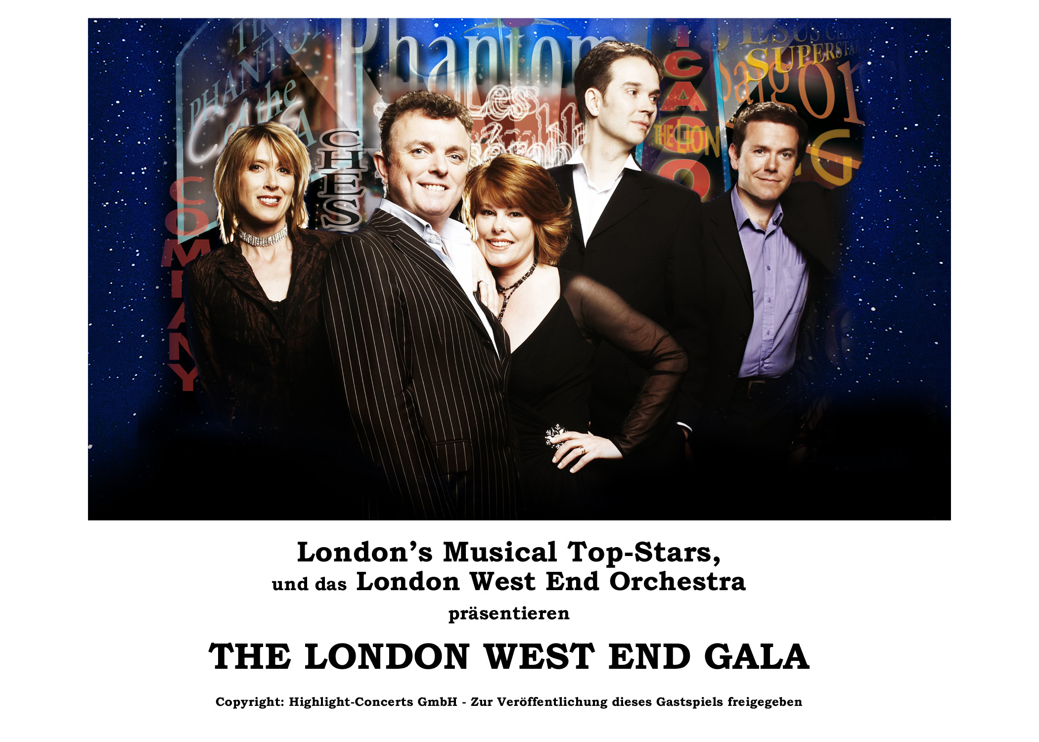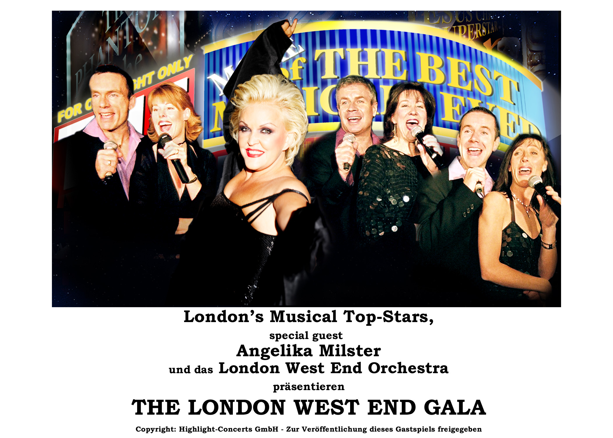 London’s Musical Top-Solisten präsentieren in einer erstklassigen Show gemeinsam mit dem Weltstar Angelika Milster und dem London West End Orchestra die schönsten und erfolgreichsten Hits aus Thriller, Mamma Mia, Moulin Rouge, Hairspray, Evita, Cats, Billy Elliot, Das Phantom der Oper, We Will Rock You, König der Löwen, Dirty Dancing und vielen weiteren mehr!