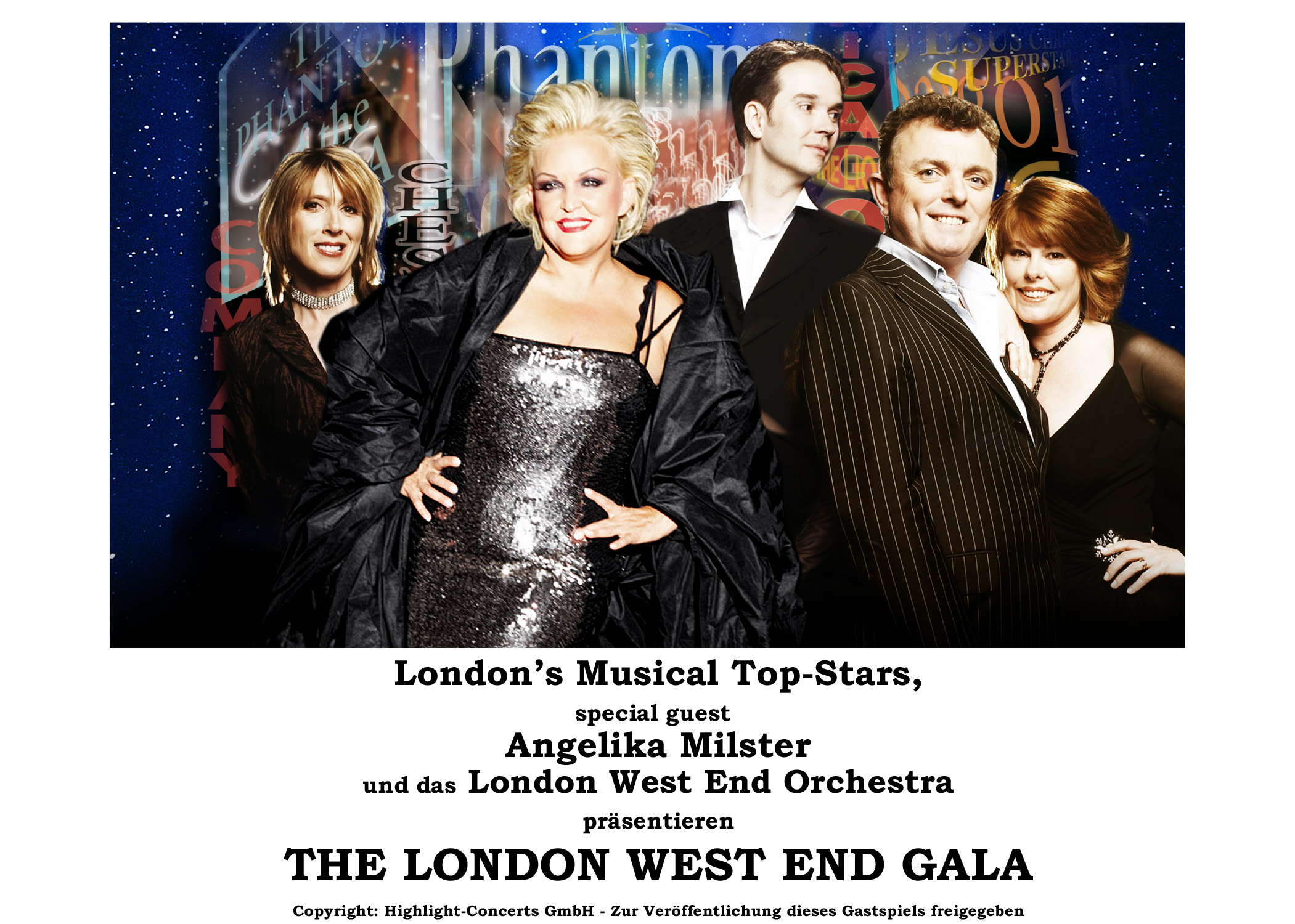 London’s Musical Top-Solisten präsentieren in einer erstklassigen Show gemeinsam mit dem Weltstar Angelika Milster und dem London West End Orchestra die schönsten und erfolgreichsten Hits aus Thriller, Mamma Mia, Moulin Rouge, Hairspray, Evita, Cats, Billy Elliot, Das Phantom der Oper, We Will Rock You, König der Löwen, Dirty Dancing und vielen weiteren mehr!