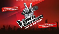 Der Live-Ableger THE VOICE OF GERMANY – LIVE IN CONCERT setzt bei den Konzerten auf gemütliche Wohnzimmeratmosphäre. Bereits seit der zweiten Staffel werden die musikalischen Geschichten um die besten Stimmen Deutschlands auf der großen Live-Bühne weitergeschrieben. On the Road immer mit dabei: Die vier Finalistinnen der TV-Sendung, zwei vom Publikum gewählte Wildcard-Gewinner und natürlich die Live-Band. Seite an Seite bringen sie Gänsehautmomente in die Konzerthallen des Landes.
